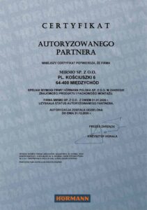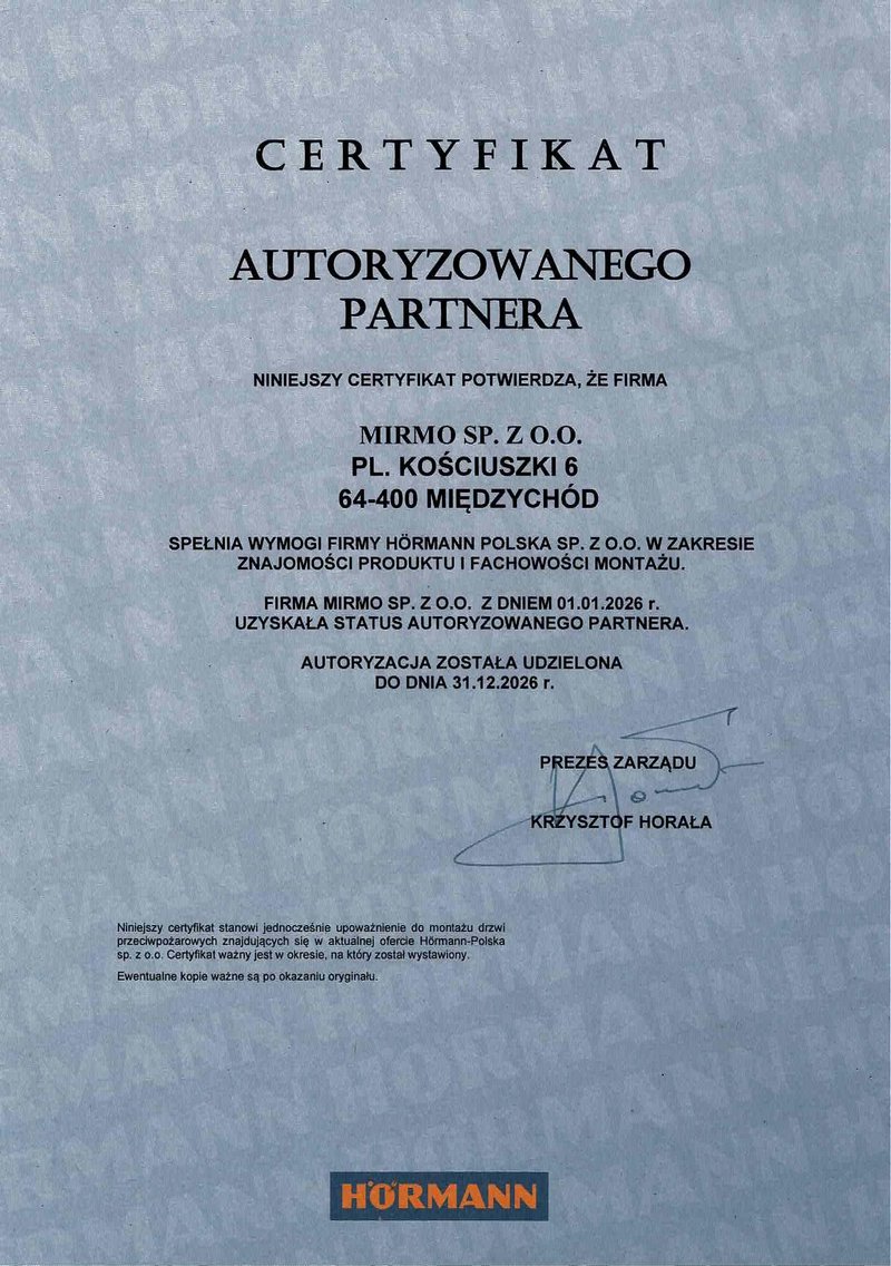 MIRMO to obecnie jeden z największych dealerów firmy HÖRMANN działający na terenie Polski. Nasza siedziba mieści się w Międzychodzie a główne obszary naszej działalności to Wielkopolska oraz woj. lubuskie. Nasze wieloletnie doświadczenie w zakresie znajomości i doboru produktów zostało uhonorowane certyfikatem Autoryzowanego Partnera, a fachowy i profesjonalny montaż certyfikatem Autoryzowanego Serwisu.